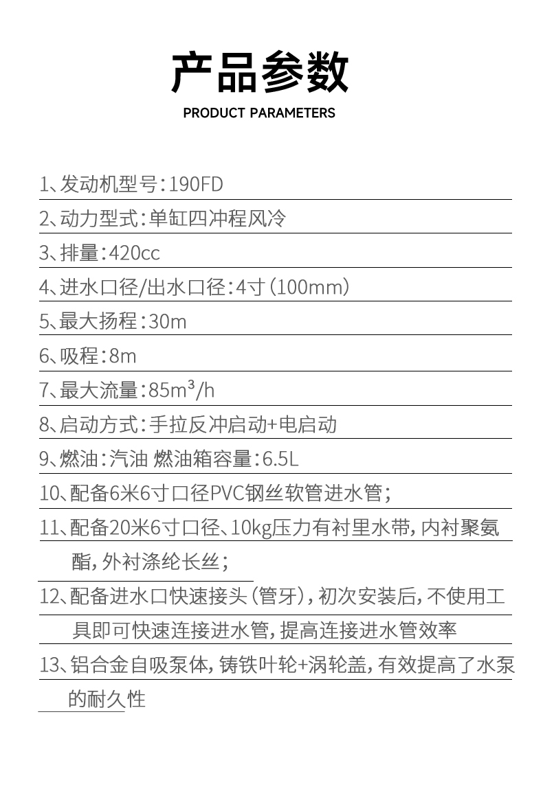 2. 动力充足,运行稳定:搭载 190FD 型号发动机,配合 3600r/min 的额定转速,为水泵提供持续稳定动力,保障高流量排水持续作业。