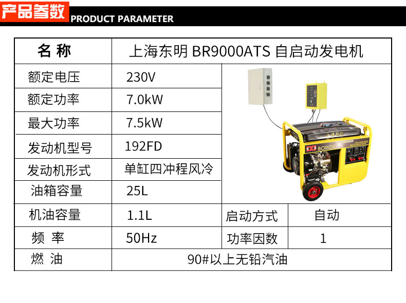 * 表示必填采购:单相7.5kW无人值守ATS小型汽油发电机组BR9000ATS
