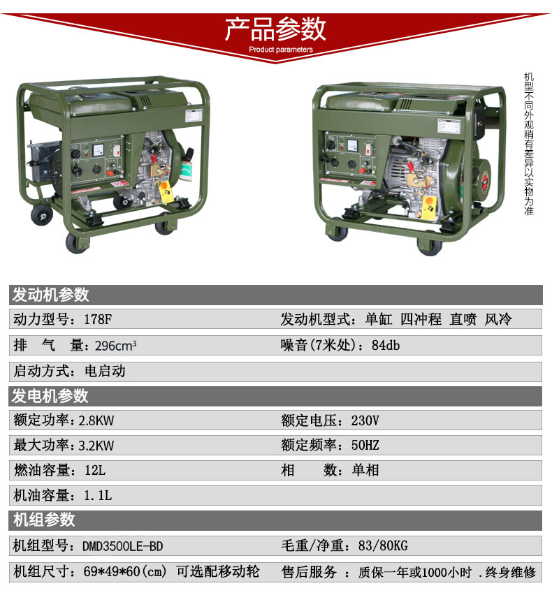 * 表示必填采购:野外训练配套小型3kw柴油发电机组 DMD3500LE-BD